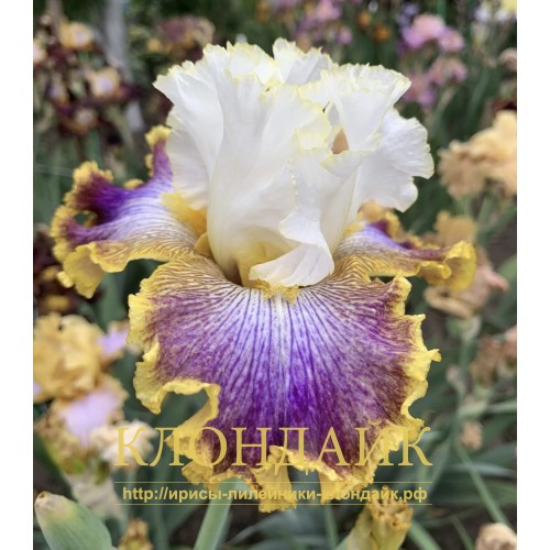 S - ЧИСТО-БЕЛЫЕ, С НЕЖНОЙ ТОНКОЙ ЗОЛОТИСТОЙ КРОМКОЙ. F - БЕЛЫЕ МЕЛОВЫЕ В ЦЕНТРЕ С ТЕМНО-ПУРПУРНЫМ РИСУНКОМ ЧАСТЫХ ЖИЛОК. НАСЫЩЕННО-ПУРПУРНЫЕ БЛИЖЕ К КРАЯМ. ЖЕЛТАЯ КАЙМА И ШИРОКИЕ ПЛЕЧИКИ. В - ЗОЛОТИСТО-ЖЕЛТАЯ. ГОФРИРОВАННЫЙ! КРУЖЕВНОЙ! ИНТЕРЕСНЫЙ ЯРКИЙ ЦВЕТОК!, L, 91см. |